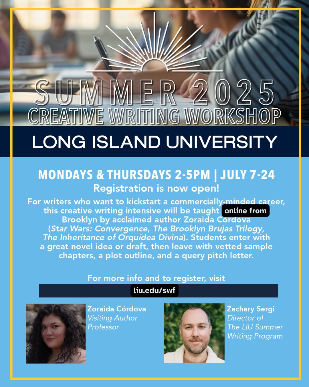 For writers who want to kickstart a commercially-minded career, this creative writing intensive will be taught online by acclaimed author Zoraida Córdova (Star Wars: Convergence, The Brooklyn Brujas Trilogy, The Inheritance of Orquídea Divina). Students enter with a great novel idea or draft, then leave with vetted sample chapters, a plot outline, and a query pitch letter. Students will engage in peer review of their writing and experience lectures on the publishing industry (from drafting, to editing, to agents and editor relationships, to book production and promotion). Students can also expect class visits from experienced agents and editors. All fiction genres welcome, no prerequisites required. Students also gain access to the LIU Writing Society, a new community of exclusive chats and events.